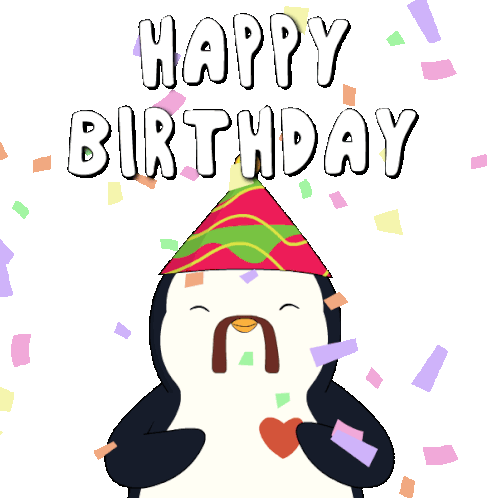 A cheerful animated penguin in a party hat celebrates with confetti, wishing a Happy Birthday to someone special.