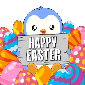 A cute blue cartoon penguin, known as Pengu, holds a "Happy Easter" sign surrounded by colorful Easter eggs.