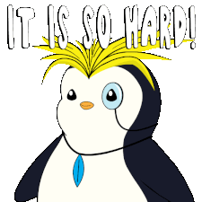 A frustrated penguin with a monocle and yellow hair spreads its arms, exclaiming 'IT IS SO HARD!' in a relatable moment.