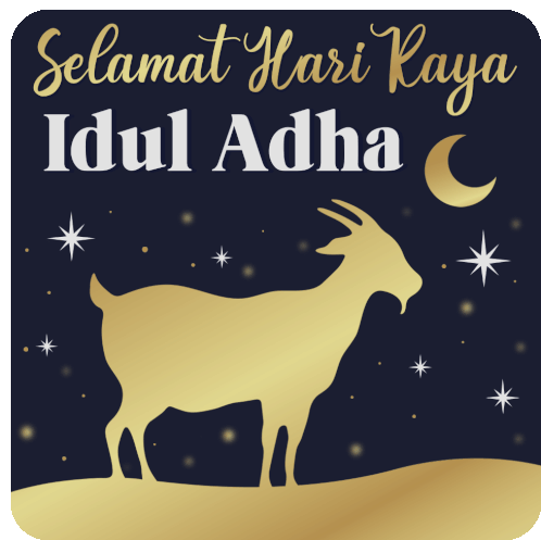 A festive greeting sticker for Eid al-Adha, featuring golden text 'Selamat Hari Raya Idul Adha' and a goat silhouette.
