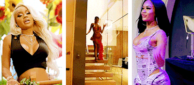 Harmonymaraj Saweetie showcasing various glamorous looks in a dynamic collage, featuring a pregnant pose, a red gown, and a money-patterned top.