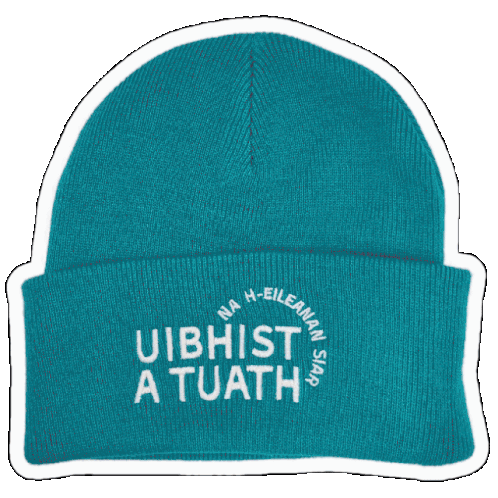 Animated sticker of a beanie hat changing color, featuring 'Uibhist a Tuath' (North Uist) and 'Na h-Eileanan Siar' (The Western Isles) embroidery.