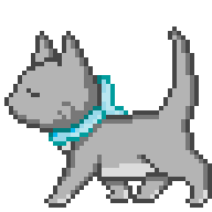 A pixel art grey dog with a blue scarf is followed by the animated text 'I HATE YOU' with a 3D effect.