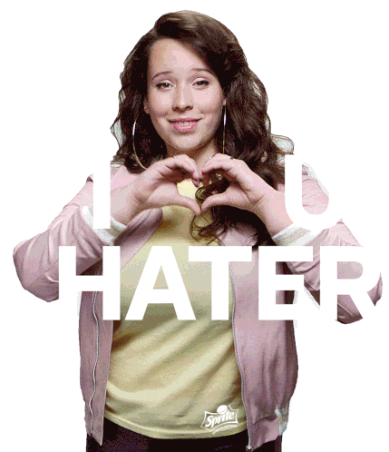 A cheerful woman forms a heart with her hands, with the text 'I ❤️ U HATER' and a Sprite logo, expressing playful defiance.