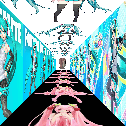 Animated sticker featuring Hatsune Miku in a pixelated Fortnite-themed hallway, with multiple Miku images and pink-haired characters.