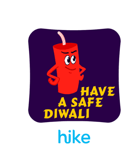 A vibrant animated sticker featuring a cartoon firecracker character with a matchstick, wishing 'Have A Safe Diwali' from Hike.