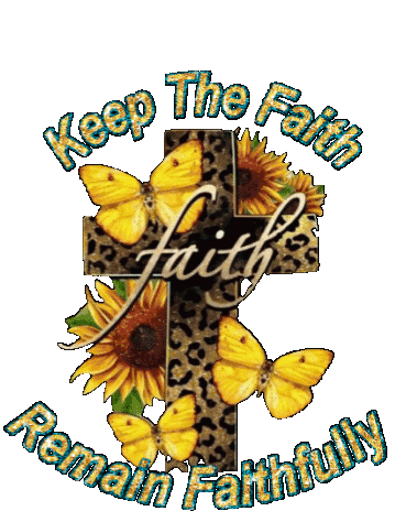 An animated sticker featuring a leopard print cross adorned with sunflowers and yellow butterflies, displaying the encouraging message 'Keep The Faith' and 'Remain Faithfully'.