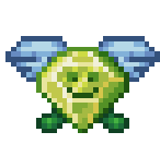 Havi, the pixel art green gem creature from Fiveamp, bobs with blue wings in this animated sticker.