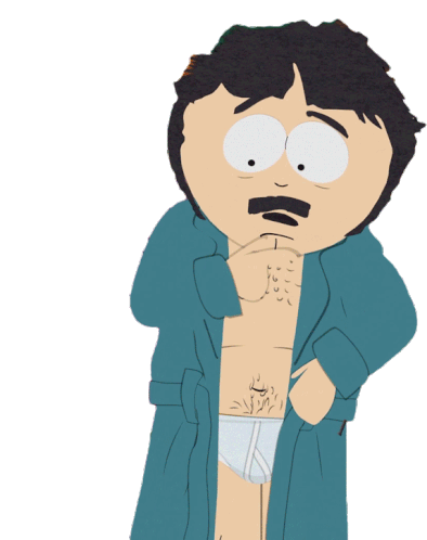 Randy Marsh, from South Park, stands in a blue robe and white briefs, looking surprised as if he just had a brilliant idea.