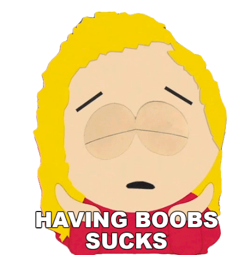 Bebe Stevens from South Park expresses her distress with the caption "HAVING BOOBS SUCKS", capturing a relatable and humorous moment.