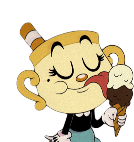 Ms. Chalice from The Cuphead Show happily licks a delicious two-scoop ice cream cone, eyes closed in pure enjoyment.
