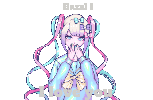 Hazel Kangel, a pixel art anime girl with pigtails, expresses 'I love you' with a shy, affectionate gesture.
