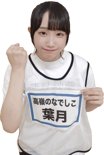 a girl in a white shirt holds up a sign that says ' 葉月 ' on it