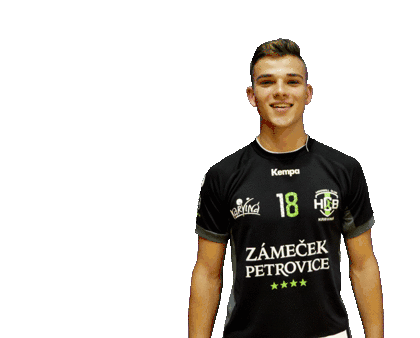 Siroky, a player for HCB Karvina, proudly flexes his bicep in his team jersey, showcasing strength and team spirit.
