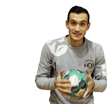 A Hcb Karvina handball player comically pretends to bite and eat a green and white handball with an exaggerated expression.