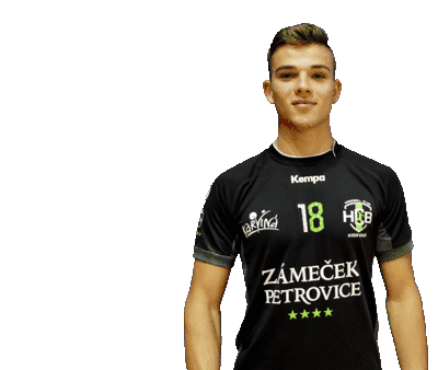 Siroky, a young HCB Karvina handball player, stands proudly in his team jersey with his hand on his chest.