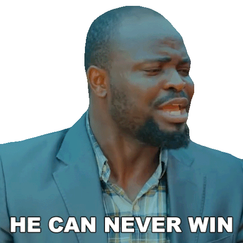 Kingsley Kbrown, from Mark Angel TV, looks disappointed with the caption 'HE CAN NEVER WIN', conveying a sense of defeat or skepticism.