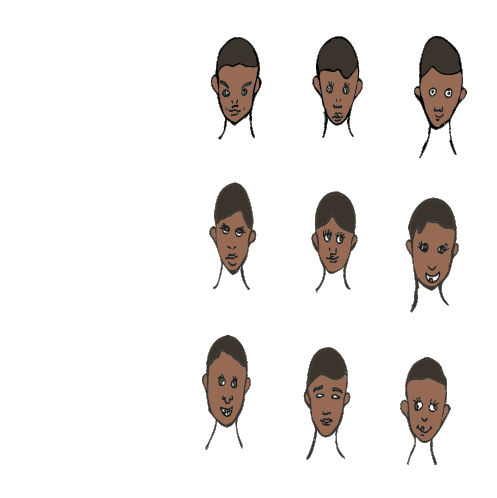 A grid of nine animated cartoon faces, each displaying a different expression from happy to confused, drawn in a simple style.