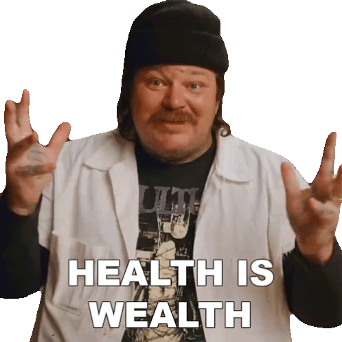 Matty Matheson, wearing a beanie and white coat, gestures emphatically while stating "HEALTH IS WEALTH".