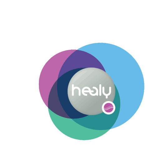 The Healy logo, a grey sphere with 'healy' text, animates with subtle frequency waves and vibrant overlapping circles.
