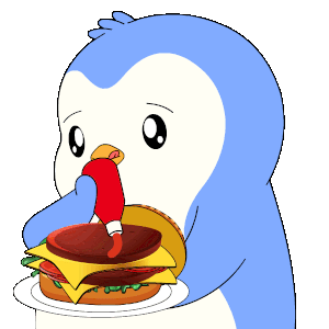 A cute animated penguin happily squeezes a ketchup bottle, forming a heart shape on a delicious hamburger.