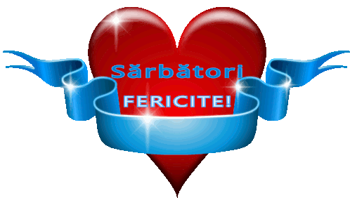 A sparkling red heart with a blue banner wishing "Happy Holidays" in Romanian, conveying festive cheer.