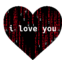A pixelated heart filled with falling red and white Matrix code, displaying the message 'i love you'.