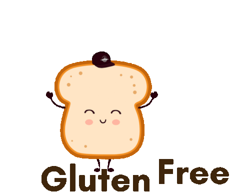 Cute animated bread slice character wearing a cap, smiling and moving, with 'Gluten Free' text below.