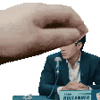 a man in a suit is sitting at a table with a microphone and a sign that says awawh on it