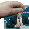a man in a suit is giving a speech in front of a microphone while a hand is covering his face .