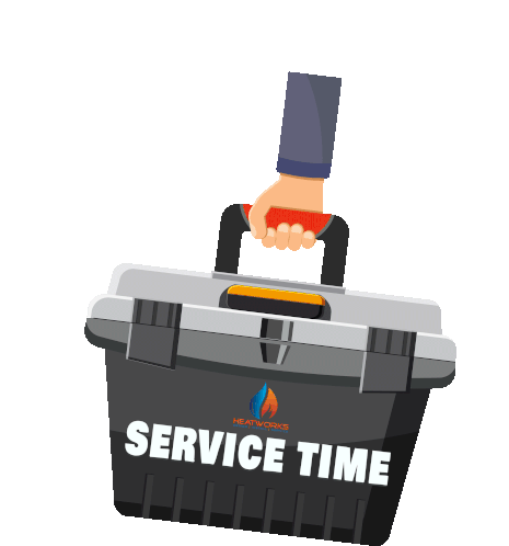 A hand carries a toolbox with the Heatworks logo, indicating 'Service Time' for plumbing and heating needs.