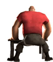 Heavy, the iconic TF2 character, squats on a wooden bench, showcasing his strength in this animated sticker.