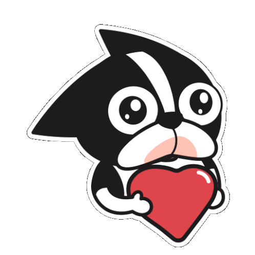 An adorable Heedong Dog character, a black and white cartoon puppy, lovingly hugs a big red heart, perfect for expressing affection.