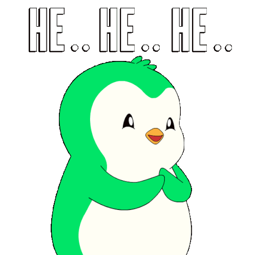 A cute green and white cartoon penguin giggling with 'HE.. HE.. HE..' text appearing above its head, expressing amusement.