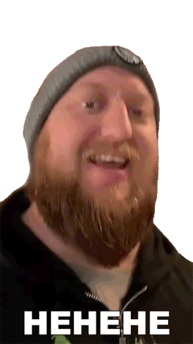 Dj Hunts, a bearded man in a beanie, laughs heartily with the caption 'HEHEHE' displayed below him.