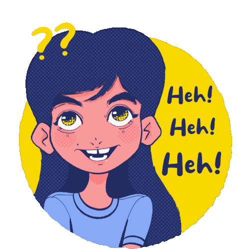 Animated sticker of a cartoon girl with a mischievous smile, saying 'Heh! Heh! Heh!' and showing confusion.