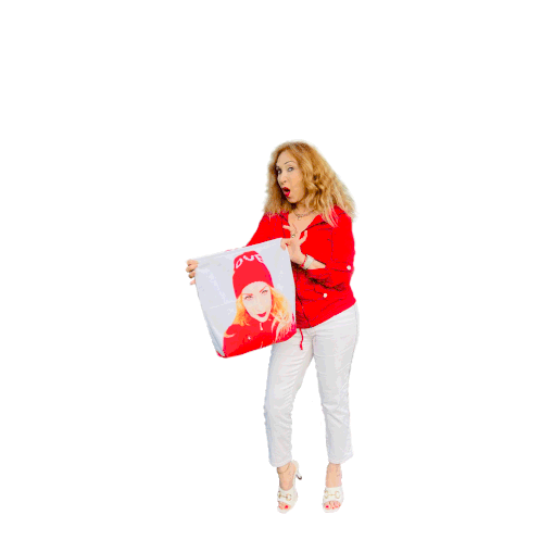 Helena Del Pilar happily shows off her custom bag with her own image on it, smiling brightly and posing.
