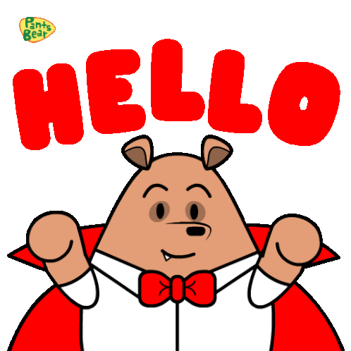 Pants Bear, dressed as a vampire, waves hello with a big red 'HELLO' text above, perfect for greetings.