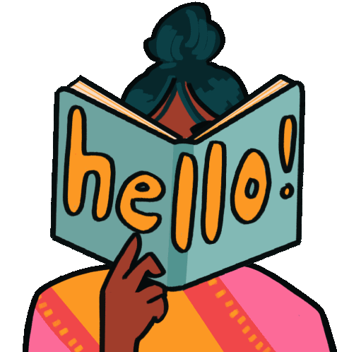 A South Asian woman peeks over a book displaying "hello!", then hides and peeks again, offering a friendly greeting.