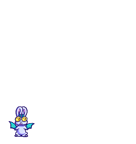 A cute, purple, winged creature with big yellow eyes jumps excitedly, greeting with a 'Hello Hi' gesture.