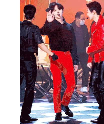 SF9's Youngbin, also known as Kim Youngbin, waves to fans on stage, wearing a black shirt and red pants.
