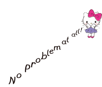 Hello Kitty, in her purple dress and pink bow, confidently says 'No problem' with a cheerful smile, reassuring everyone.