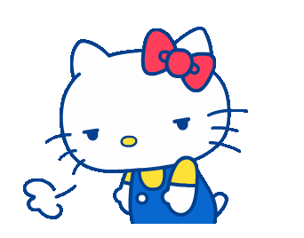 Hello Kitty is shown from the back in blue overalls, then turns to reveal a bored, annoyed expression while scratching her head.