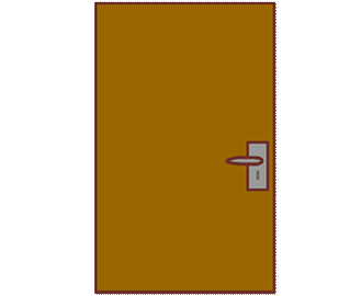 A cartoon character peeks nervously from behind a partially open brown door, saying 'hello' or 'hi'.