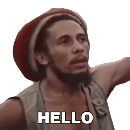 Robert Nesta Marley, the reggae legend, greets with a serious expression, looking up as the word 'HELLO' appears.