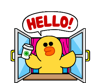 A cute animated yellow duck character waves from a window, holding a coffee cup and saying 'HELLO!'.