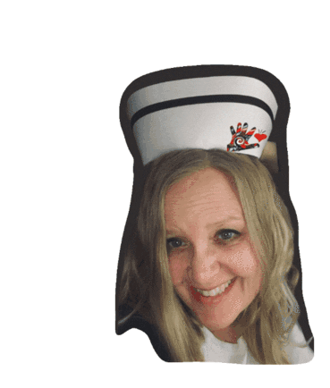 Dr Sandy, the smiling nurse, greets with a friendly 'Hello There' while wearing her distinctive nurse's cap.