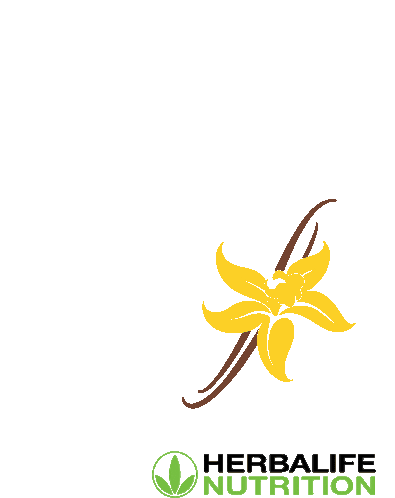 An animated sticker featuring the Herbalife Nutrition logo alongside a vibrant yellow flower and elegant brown vanilla bean pods.