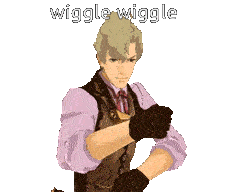 Herlock Sholmes from The Great Ace Attorney Chronicles wiggles playfully, with 'wiggle wiggle' text appearing above him.