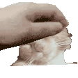 A close-up of a person gently petting the head of Hermes Cat, also known as Ravens Stupid Cat, in a tender moment.
